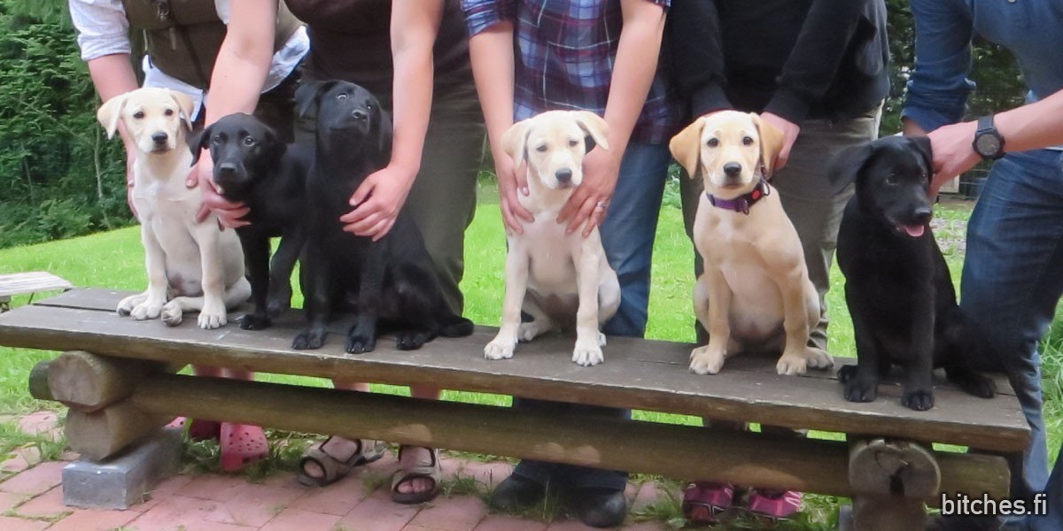 These photos are from yesterday as we had the first vaccination at our breeder’s place. Here in Finland vaccinations are when the puppy is 12 weeks and 16 weeks old, and many times breeder’s organize a vet to come to their place so that all the puppies can get vaccinated at the same time. There was six of the puppies present: two yellow bitches, one yellow dog and three black bitches, as well as Dharma’s 5-year-old grandma and 1-year-old half-sibling Nala. The rest of the English text is located below the photos. 🙂