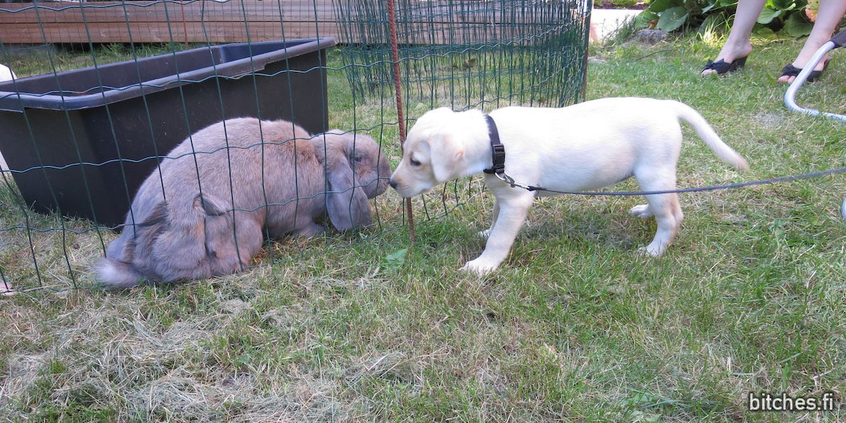 Last weekend we were at a barbeque party at Espoo. There were about twenty people, few smaal kids and two bunnies. Dharma was really good with the children and wanted to play with the bunnies as well, but bunnies didn’t agree – though one of them came to check what’s this weird little animal who’s all excited outside bunny’s home.