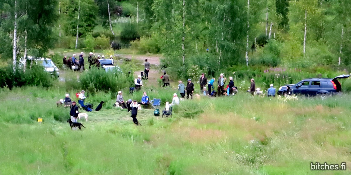 Vesipisteellä olimme katsomassa mestaruus-sarjan vesinoutoa, jossa ammuttiin ja heitettiin dami veteen, mutta koira piti kesken noudon ohjata sivuun hakemaan vasemmalla olevalta pieneltä saarekkeelta sinne etukäteen laitettu dami jota koira ei nähnyt. Sen tuotuaan koira lähetetään takaisin hakemaan sitä alun perin ammuttua & heitettyä damia, ja koiran olisi tarkoitus keskeytyksen jälkeen muistaa, missä se on. Vesinoudosta oli haasteellista saada kuvia koska lampea reunusti runsas kasvillisuus, joten näissä kuvissa osallistuva koirakko on kuulemassa ohjeita tuomarilta (oikealla/keskellä ruskeassa takissa) ja odottamassa aloituslupaa. Kuvan tuomari on itseasiassa belgialainen Lydia jonka uros on pentueemme isä, ja jolle meni pentueemme toinen uros toisen jäädessä kasvattajalle itselleen.