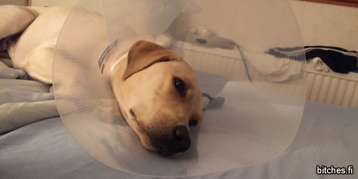 Arpi parantui hyvin, ja Dharma ei osoittanut mitenkään älytöntä haavanhoitamisintoakaan (“99% infektioista johtuu siitä että potilas itse osallistuu haavan hoitoon”, sanoivat lääkäriasemalla). Kuupan kanssa Dharmalla oli vähän ongelmia, sillä vasta kuupan myötä tajusimme kuinka kapeita paikkoja meidän kotimme on täynnä. Niinpä ostimme vielä lisäksi haavapuvun, jonka avulla Dharma sai vietettyä päivät vähän rennommin. Haavapuku oli ihan toimiva ratkaisu – olisihan sen läpi varmaan jotain tuhoa saanut aikaan, mutta kun ei Dharma niin innolla yrittänyt.