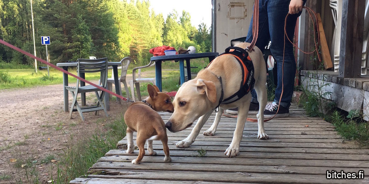 The other day at the weekly obedience training at our dog association’s training field Dharma met the tiniest little puppy. The puppy belongs to a fellow member of the dog association, and she will have a career as a rat dog as soon as she grows up (not that she’s gonna grow a lot though 😀 ). At first Dharma was a bit confused but after a period of careful get-to-know she decided that the puppy is good company.