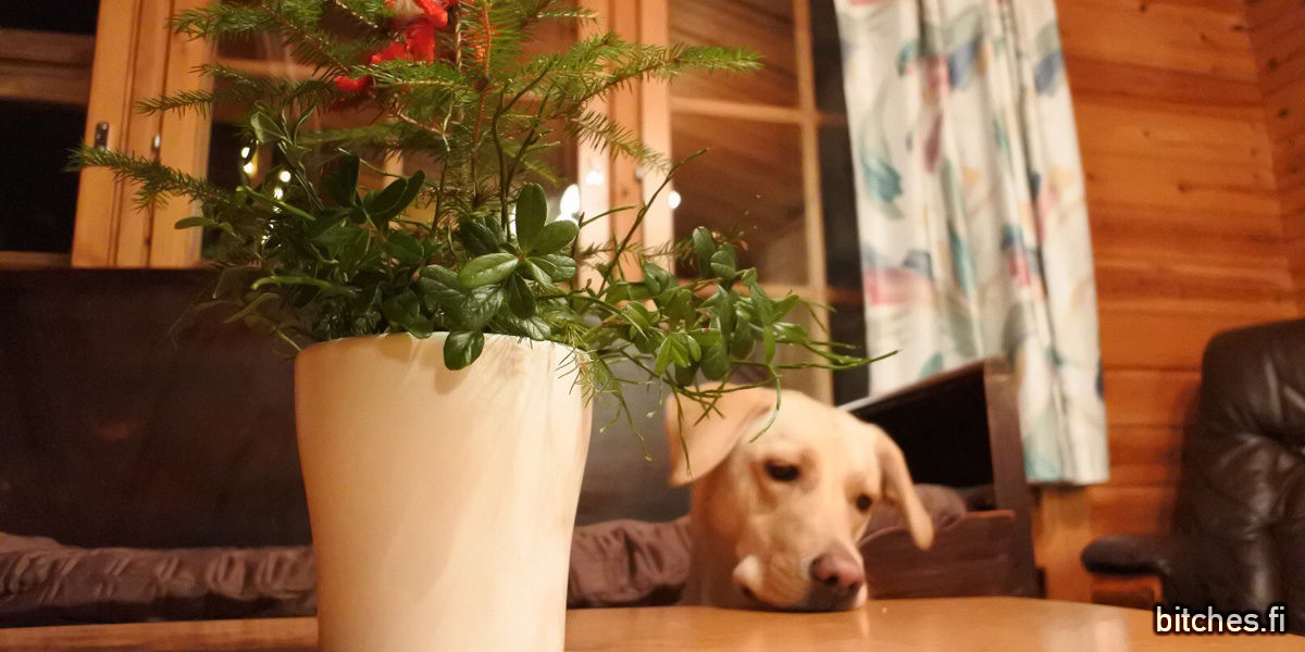 Jouluaattona huomio sai sitten vähän toisenlaisia ulottuvuuksia kun Dharma alkoi rapsuttaa silmäkulmaa ja pian huomasimme silmänympäryksen olevan punainen ja turvonnut. Myös kuonon päälle nousi paukamia. Tarkkailimme paukamia illan ajan, mutta aika pian – noin tunnissa – ne laskivat pois ja Dharmankin olo tuntui helpottuvan.