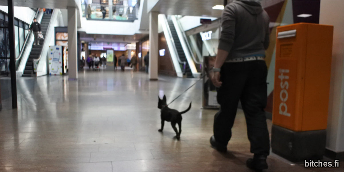 Some time ago we took both dogs to shopping mall, Itis, that welcomes dogs inside. (Here in Finland all our malls are inside malls since nobody would visit outside malls winter time. 😀 ) For Bri it was sozializing (getting familiar with crowds, different surfaces, elevators, stairs etc etc), and it went super well. Bri was brave and enthusiasted and acted like a natural.
